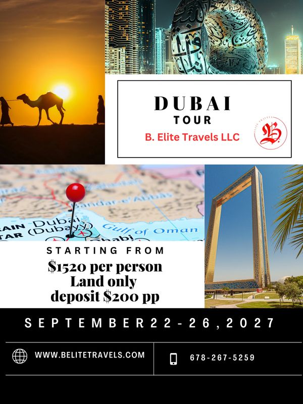 We are Dashing to Dubai Setember 2027. Enjoy 5 days and 4 nights with 4-5 star accommodations, scheduled excursions, some meals and transportation is included. Price is per person based on double occupancy. Trip is land only package.